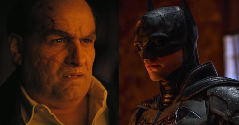 “There it is,” said Colin Farrell when seeing co-star Robert Pattinson in costume for the first time on set of The Batman. An unrecognizable Farrell